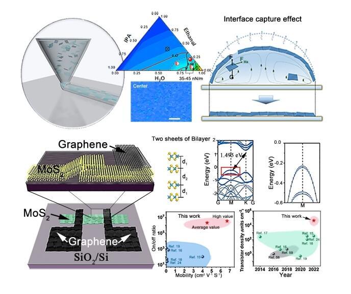二維(2D)半導(dǎo)體材料為將摩爾定律擴(kuò)展到原子尺度提供了機(jī)會。與傳統(tǒng)基于蒸鍍和光刻技術(shù)的加工技術(shù)相比,印刷電子因成本效益、靈活性以及與不同襯底的兼容性而受到關(guān)注。目前,印刷的二維晶體管受到性能不理想、半導(dǎo)體層較厚和器件密度低的制約。同時(shí),多數(shù)二維材料油墨通常使用高沸點(diǎn)溶劑,隨之而來的問題包括器件性能退化、高材料成本和毒害性等,難以大規(guī)模應(yīng)用。因此,發(fā)展簡單且環(huán)保的策略對于制造低成本、大規(guī)模的打印二維材料功能器件具有重要意義。