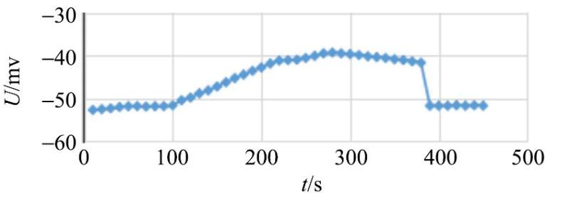 實驗過程:接通電源,將儀器預熱15min;在傳感器橫梁端頭的小鉤上掛砝碼盤并進行定標;將金屬吊環(huán)清潔干凈,調(diào)平后掛在傳感器的小鉤上;實驗時,先將吊環(huán)置于密度較大的液體Ⅰ中,然后再注入密度較小的液體Ⅱ,調(diào)節(jié)流速調(diào)節(jié)器控制從容器底部緩慢勻速排出液體的流速,測量出電壓U隨時間t的變化曲線。圖2為純凈水和硅油的界面張力測量過程中電壓U隨時間t的變化曲線。