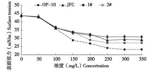農藥制劑噴霧使用時,藥液的表面張力會影響到藥液在植物葉片上的潤濕性能和持留量,很多藥液難以在水稻、小麥和甘藍葉面濕潤展布,是由于藥液的表面張力大于這些植物的臨界表面張力,因此要選用能顯著降低表面張力的表面活性劑,或增加表面活性劑的用量,使藥劑推薦劑量藥液的表面張力值小于水稻的臨界表面張力值,才能有利于藥液在水稻等葉面上的濕潤。本研究中發現,2.3%甲維鹽微乳劑在推薦使用倍數下,對應藥液表面張力43.8 mN/m明顯高于水稻的臨界表面張力36-38 mN/cm,表現為藥液在葉片上難潤濕展布,因此本文通過添加4種助劑來降低藥液表面張力,當藥液表面張力低于靶標作物葉面表面張力時,藥液才能在葉面潤濕展布,提高噴霧藥液的持留量和鋪展面積,綜合考慮,4種助劑表現最優是乳化劑1#,其次是乳化劑2#,然后是JFC,OP-10表現最差。