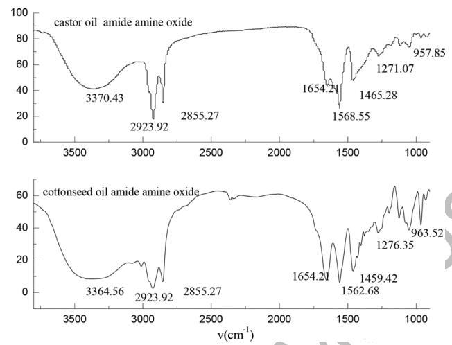 圖 3. 蓖麻油酰胺氧化胺和棉籽油酰胺胺的紅外光譜 氧化物