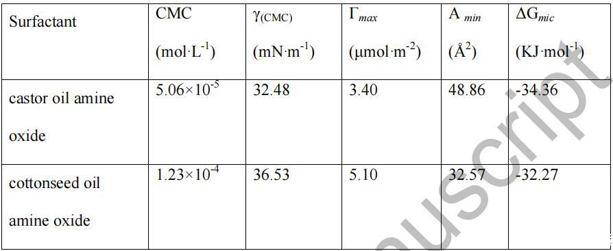 由表2可知,蓖麻油酰胺氧化胺和棉籽油酰胺 氧化胺將水的表面張力降低到最小值約 在 5.06×10-5 mol/L 的濃度下為 32.48 mN/m,在 5.06×10-5 mol/L 的濃度下為 36.53 1.23×10-4 mol/L,表明它們的表面活性很高。 和....相比 一些已報道的氧化胺表面活性劑,[12] 如十六烷基二甲基 氧化胺、十八烷基二甲基氧化胺和椰油酰胺丙基二甲基胺 氧化物等,其CMC值通常在10-4范圍內(nèi) ~10-3 mol/L, 這些 CMC 值較低。 這可能是因為幾種酰胺的混合物 氧化胺具有協(xié)同增強的作用,提高了表面 活動總體上。 還可以發(fā)現(xiàn),蓖麻油的 CMC 和 γ(CMC) 值 酰胺氧化胺遠低于棉籽油酰胺氧化胺,后者 可能是由于蓖麻油酰胺氧化胺中存在-OH。 [13] 在 另外,從表 2 中的數(shù)據(jù)可以看出,蓖麻油的Γmax 值 酰胺氧化胺低于棉籽油酰胺氧化胺,而 前者的Amin值大于后者。 這一結(jié)果可能歸因于 烷基鏈的長度。 此外,ΔGmic 的負值表明 9 在 25 oC 時,膠束化是自發(fā)的,這意味著這兩種天然植物油 酰胺胺氧化物在空氣-水界面有極好的吸收能力 在溶液中形成膠束。