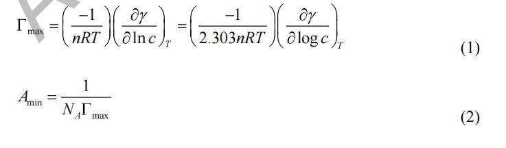 通過分析平臺獲得最小表面張力(γCMC)值 地塊的區(qū)域。 確定臨界膠束濃度 (CMC) 值 從表面張力的斷點與濃度的對數(shù) 曲線。 最大表面過量濃度(Γmax)和最小表面積 (Amin) 在空氣/水界面被每個表面活性劑分子占據(jù)的計算公式為 吉布斯吸附方程: