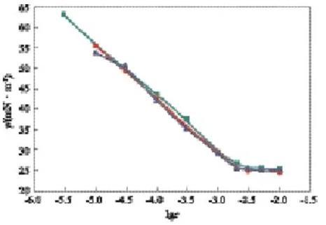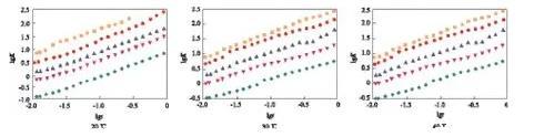 在lgc=-3.00時,可看出較完整的動態表面張力降低曲線,開始時表面張力接近溶劑的表面張力,隨時間的延長表面張力先快速下降,降至一定數值后,降幅趨緩,在一段時間內基本保持不變。因為氣/液界面新生成時,GSS362尚未在表面吸附,界面張力為溶劑的表面張力,隨著時間的延長,表面活性劑分子開始在表面吸附,氣/液界面張力降低,隨著吸附的進行,表面逐步趨于飽和,表面活性劑分子在表面吸附的速率下降,因而動態表面張力下降速率變慢,趨于平衡。