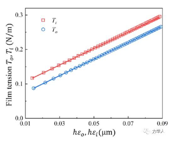 基于該平衡構型的解析解,本研究發現薄膜在接觸線附近的彈性應變可以由薄膜的鼓包角解析給出。由此,本文給出了在一般條件下,薄膜在接觸線附近的彈性應變隨鼓包角的解析關系。圖3表明,基于該解析關系給出的薄膜彈性應變可以很好的描述薄膜總張力隨薄膜厚度及接觸線附近應變的演化規律。基于此,本文提出了采用線性外推薄膜總張力隨薄膜厚度和接觸線附近薄膜應變乘積的方法來確定固體表面張力的方案。