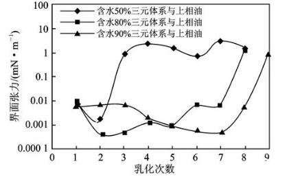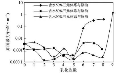界面張力的高低反應體系啟動剩余油的能力,分析含水不同的三元體系多次乳化后與原油間的界面張力見圖1。