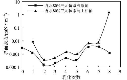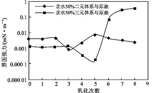 從總體上看,水相與原油間的界面張力低于其與上相油間的界面張力,在乳化第6次以后兩者開始趨同。說明乳化會導致油相中的組成發生變化,進而導致油相性質發生變化。因此在復合驅驅替的適當時機應對驅油體系的配方進行相應調整。