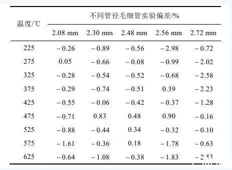 不同管徑毛細管在不同溫度下實驗結果偏差如上表2所示。可知,2.72 mm內徑毛細管與基準值偏差最大,且在不同溫度的實驗偏差波動也是最大,從表中結果可以得出,隨著毛細管內徑增大,實驗結果偏差和偏差波動隨之增大。而2.08mm、2.30mm、2.48mm三個管徑的偏差相差不大,且從低溫到高溫偏差范圍波動較小。因此,在均勻鼓泡下,實驗使用的毛細管管徑應控制在2.0~2.5mm。