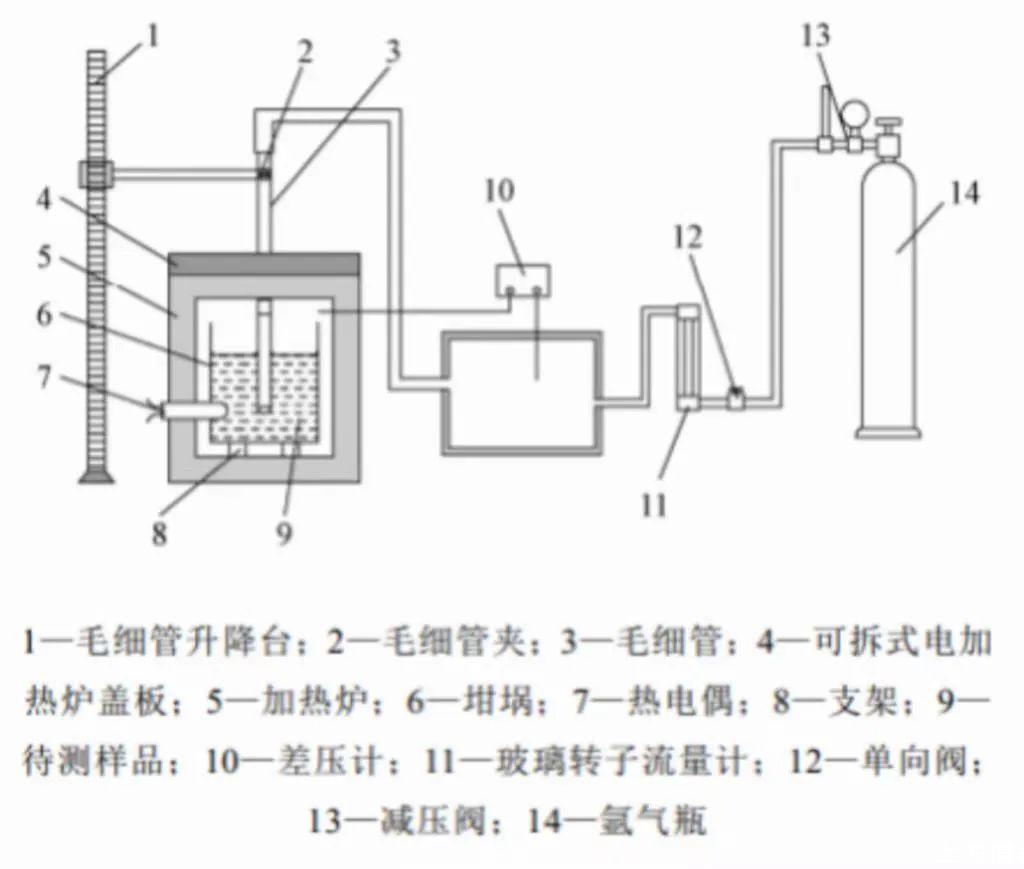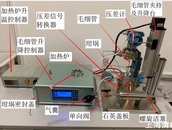 下圖為本文設計的測量裝置原理示意圖與實物圖,該裝置主要由4個系統組成:氣路系統、毛細管升降系統、加熱恒溫系統以及數據采集系統。